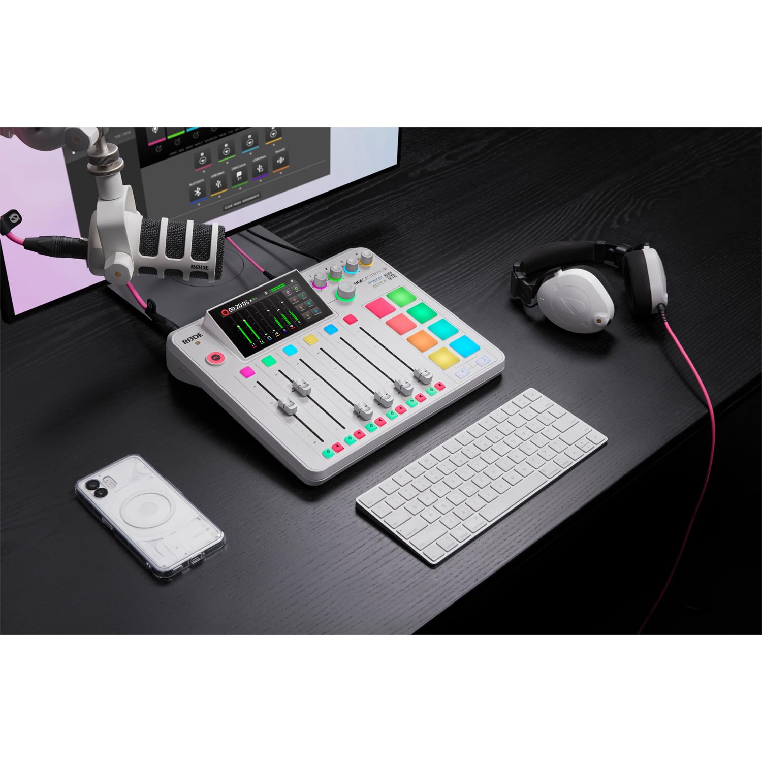 Einzelheiten: Rodecaster Pro II Podcast Station Weiss: Ideal für Podcaster, Streamer, Musiker, Content-Creator Mischpult, Recorder, Soundbank und Audio Interface Standalone-Gerät mit intuitiver Bedienung Wi-Fi und Ethernet-Anschluss / Bluetooth 9 frei belegbare Kanäle, 6 Fader, 3 virtuelle Fader 5.5 Zoll Touchscreen Endlos-Encoder mit Tastfunktion zum Navigieren Integrierte Effekte Dual USB-Audio Interface für 2 Geräte Integrierte APHEX Signalverarbeitung Stereo- und Multitrack-Aufnahmen 4 Audio-Eingänge 8 programmierbare Pads Mix-Minus und Ducking Funktion Aufnahme auf USB-Speichermedium oder Rechner 3/8 Zoll Gewinde zur Montage Eingebauter Drahtlos-Empfänger für Rode Wireless Systeme