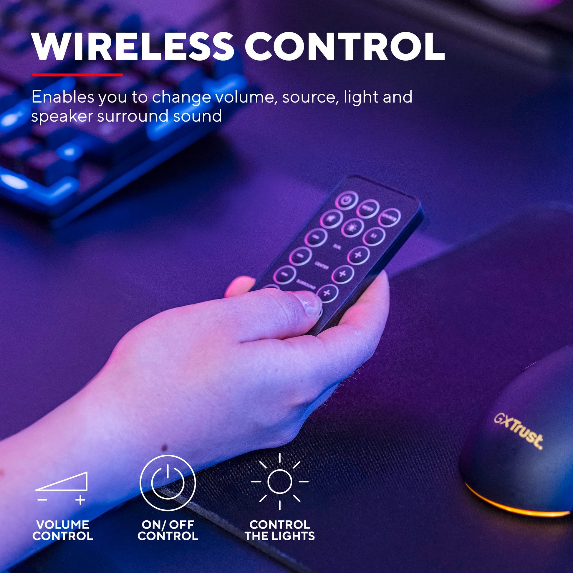 - KONTROLLE OHNE KABEL: Regele mit der kabellosen Fernbedienung ganz bequem von weitem die Lautstärke, stelle den Bass ein und wähle einen Eingang